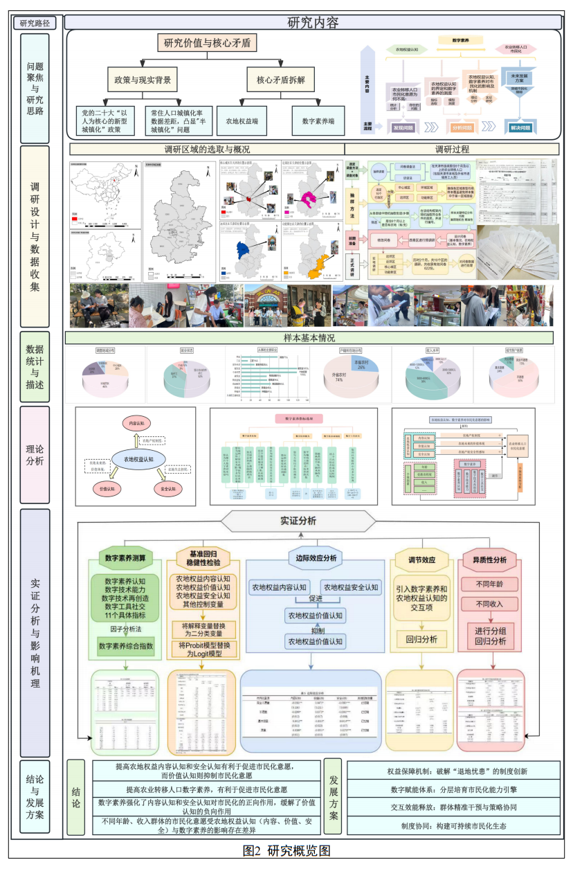 该作品基于当前农地二轮延包政策背景,通过天津市10个行政区622份农业转移人口实地调查数据,采用多项有序Probit模型进行实证分析,深入探究农地权益认知、数字素养对农业转移人口市民化意愿的影响机制。其意义在于为理解农业转移人口这一庞大群体的市民化决策逻辑、破解市民化障碍、优化相关土地和数字政策、促进高质量城镇化和城乡融合发展提供科学依据和决策参考。